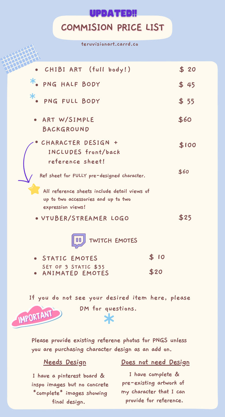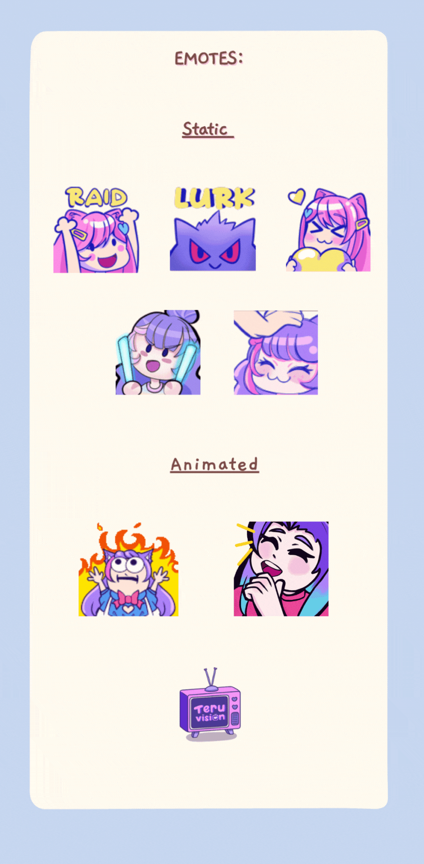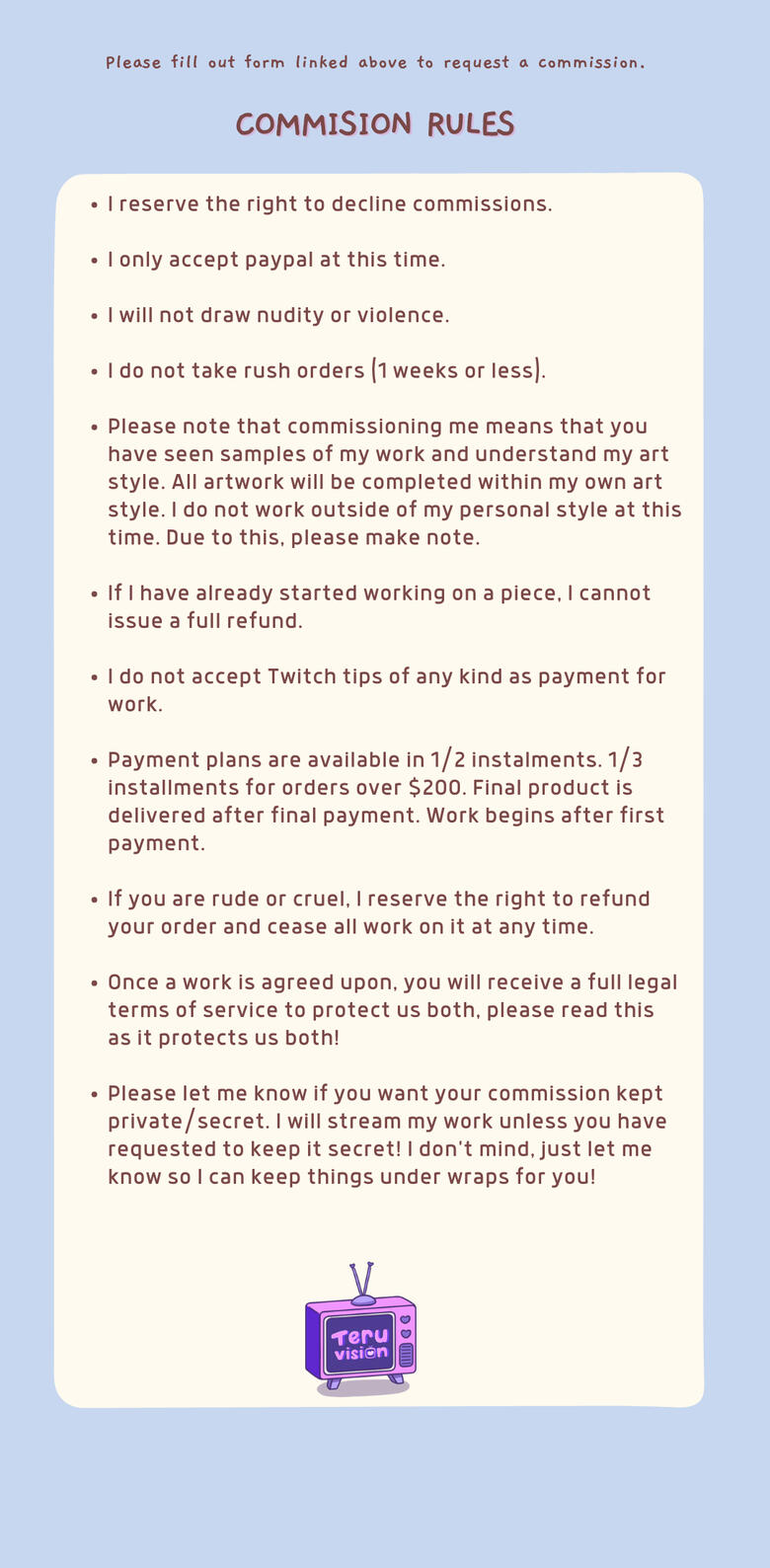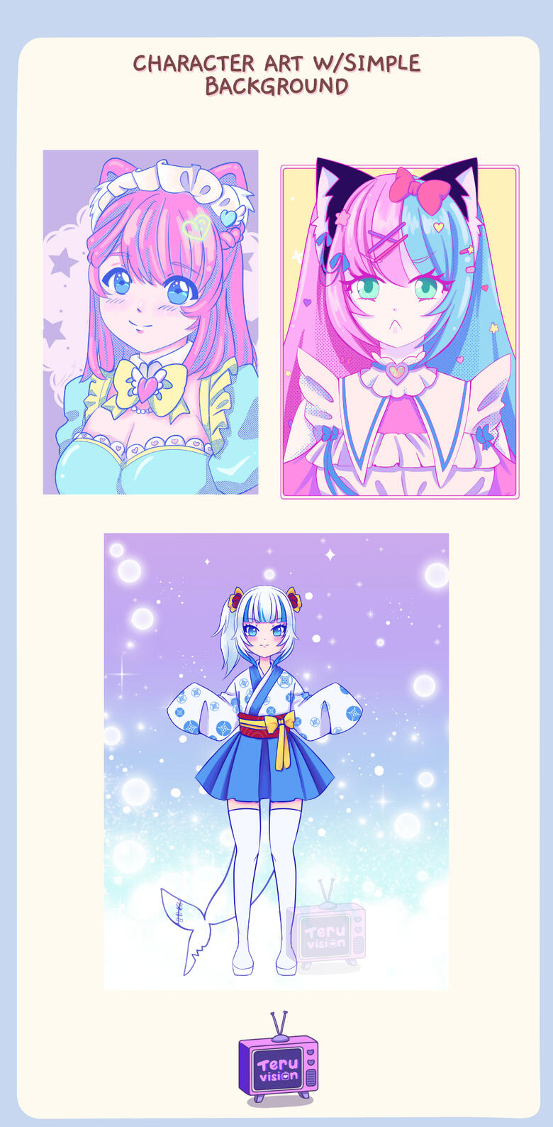 Hello! I'm Teru - A fun and friendly digital and mixed media artist who streams her process live on Twitch. I specialize in two things:★ Anime style works for streamers.★ Magical and ethereal mixed media painting that use texture and vibrant color to evoke emotion.You can find commission prices by scrolling down.I host a thriving community of supportive and caring individuals on Twitch, where all are welcome! Please feel free to join us on Sundays, Tuesday or Fridays at 8:30 PM EST